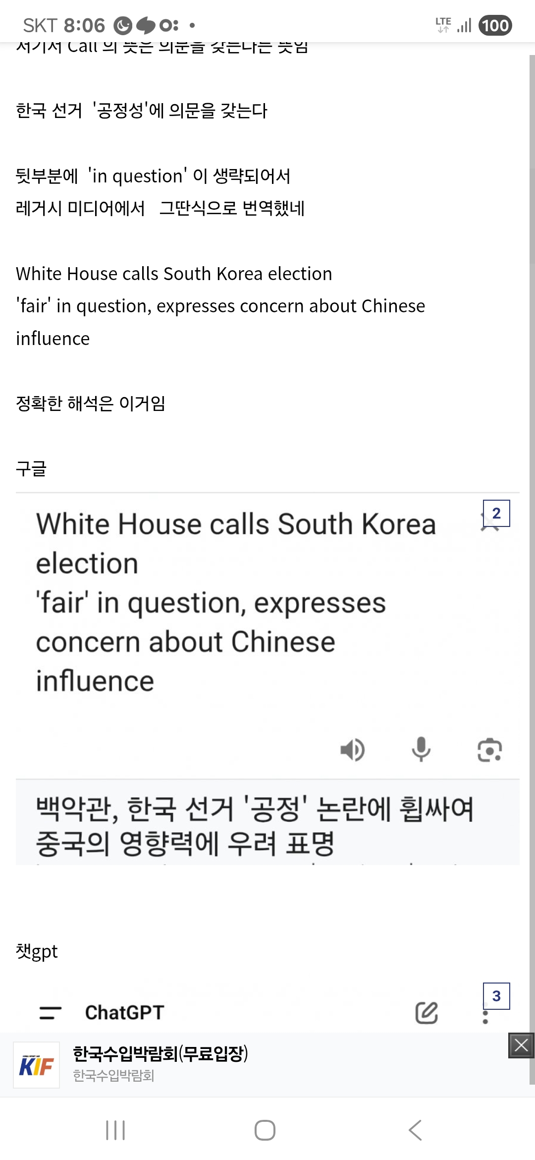 > 여기서 **'in question'**은 “의문이 제기된” 또는 “논란이 되는”이라는 의미이며, 문장 전체는 한국 선거의 공정성이 확실하지 않다는 의미로 사용된 것입니다.