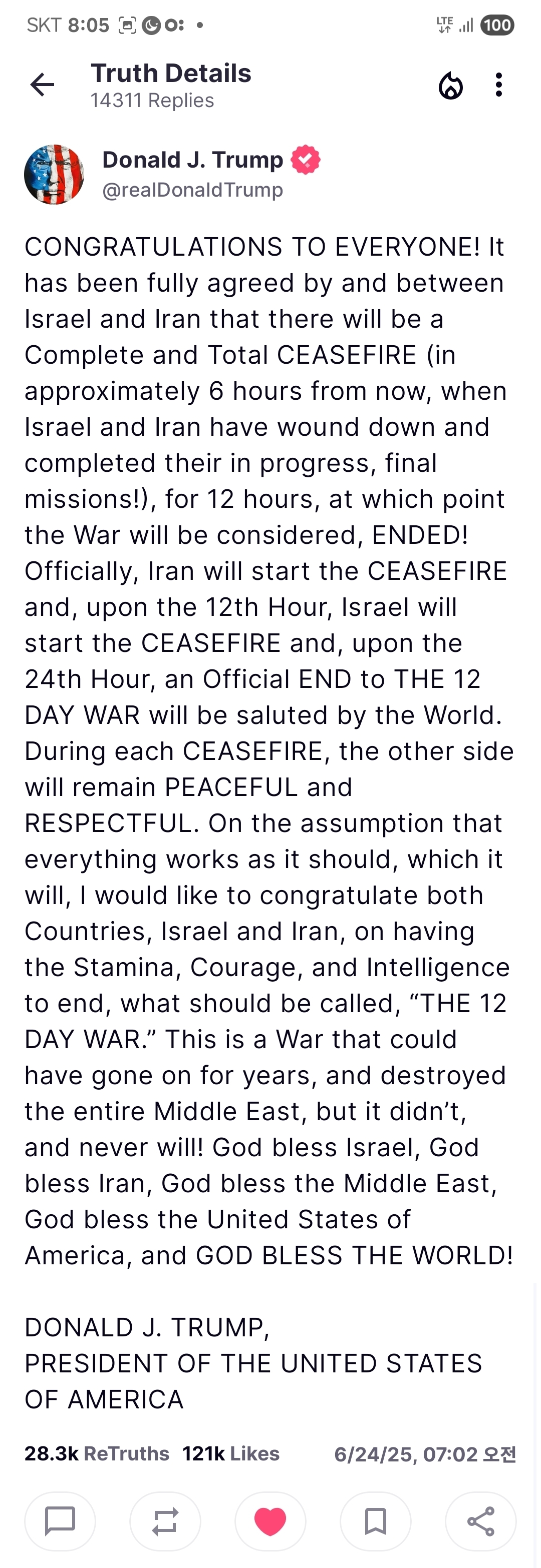 이스라엘과 이란 간에 완전하고 전면적인 휴전이 이루어졌다는 데 완전한 합의가 이루어졌습니다! (약 6시간 후, 이스라엘과 이란이 현재 진행 중인 마지막 작전을 마무리한 뒤 발효됩니다). 이후 12시간 동안 휴전이 이어지고, 그 시점에서 전쟁은 종식된 것으로 간주될 것입니다!