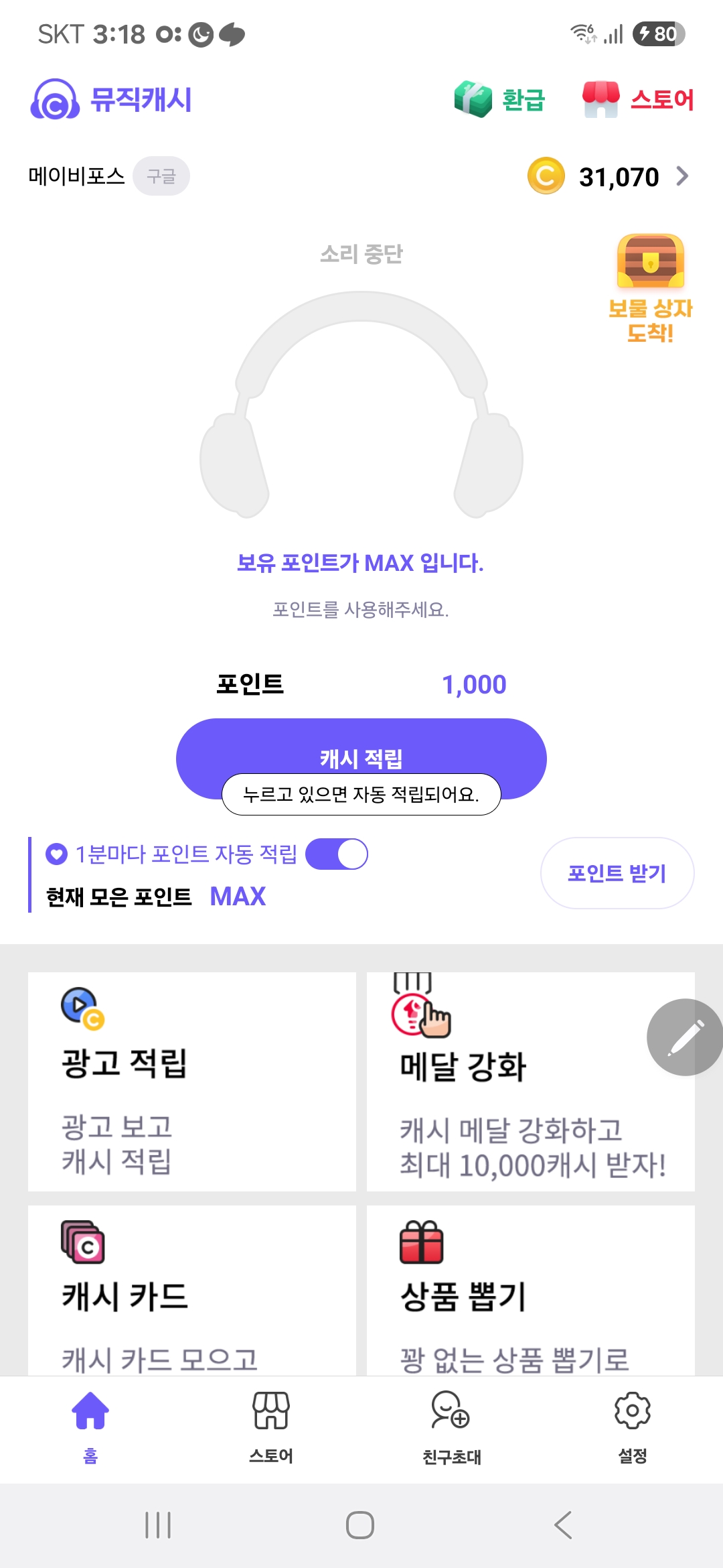 처음 들어가면 화면은 이렇게 나옵니다. 음악 들으면서 자동으로 쌓이는 포인트가 가득 차면 최대 1000포인트를