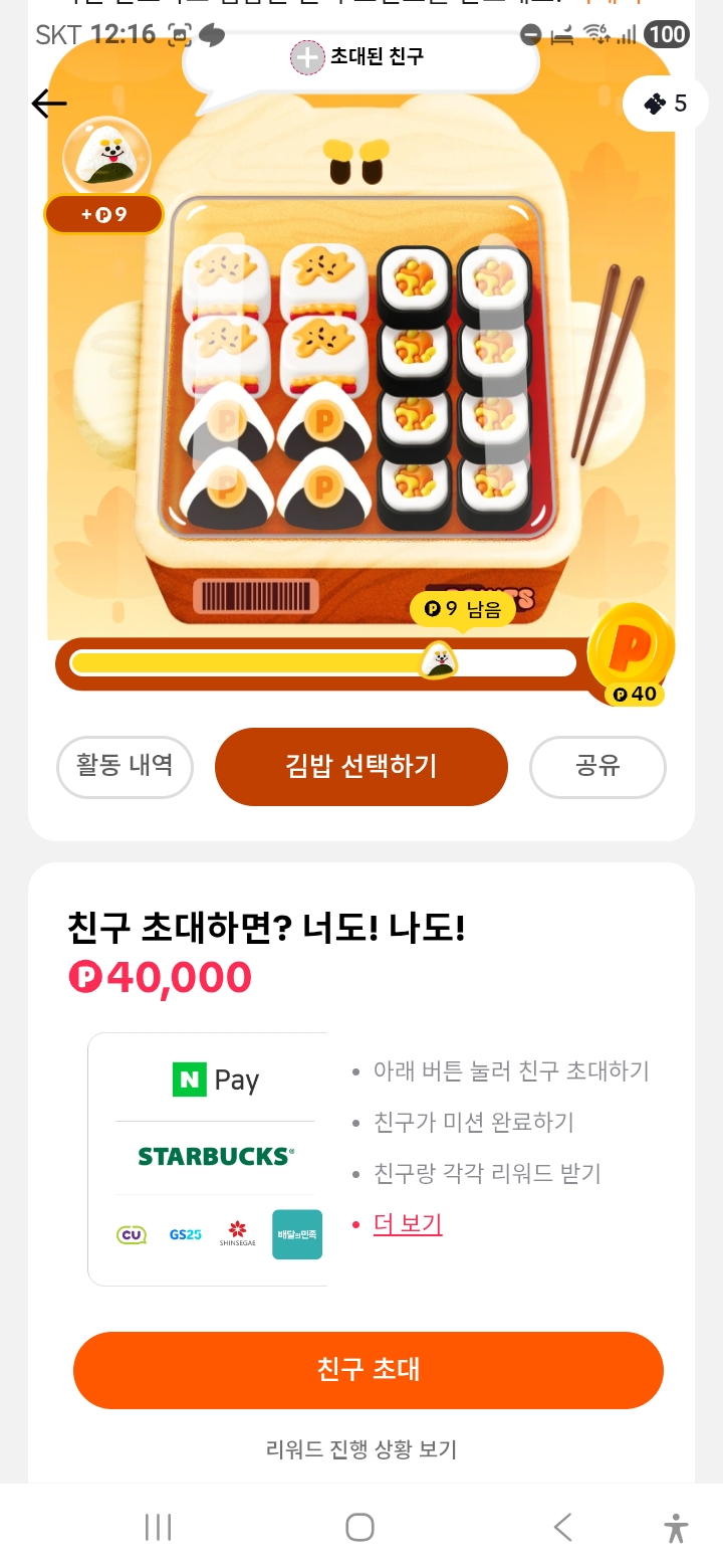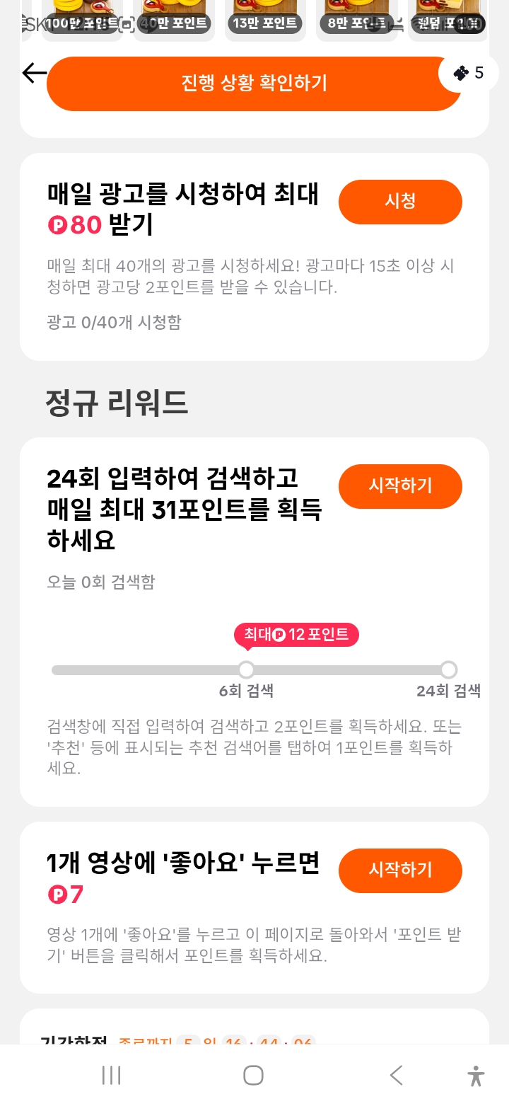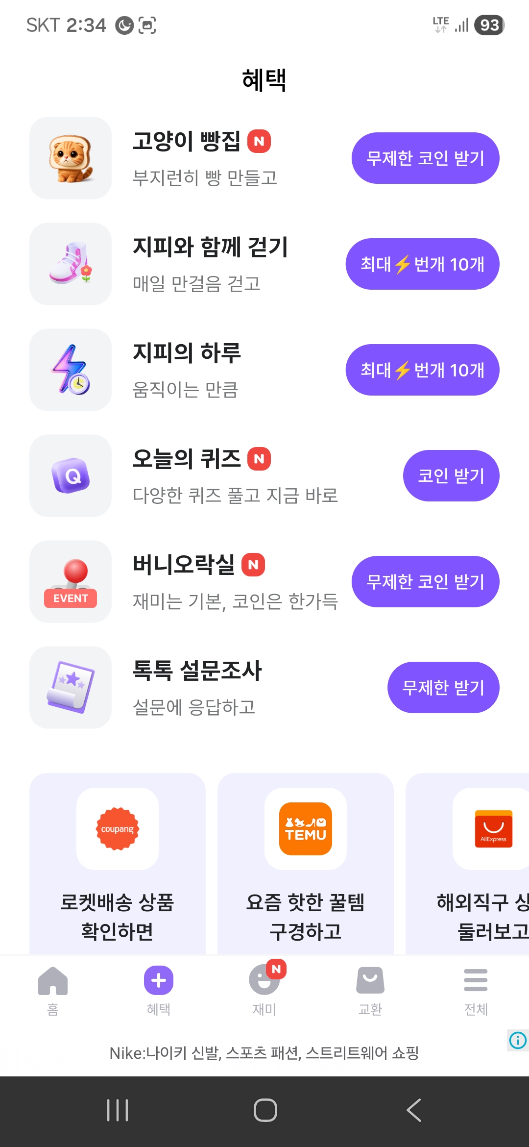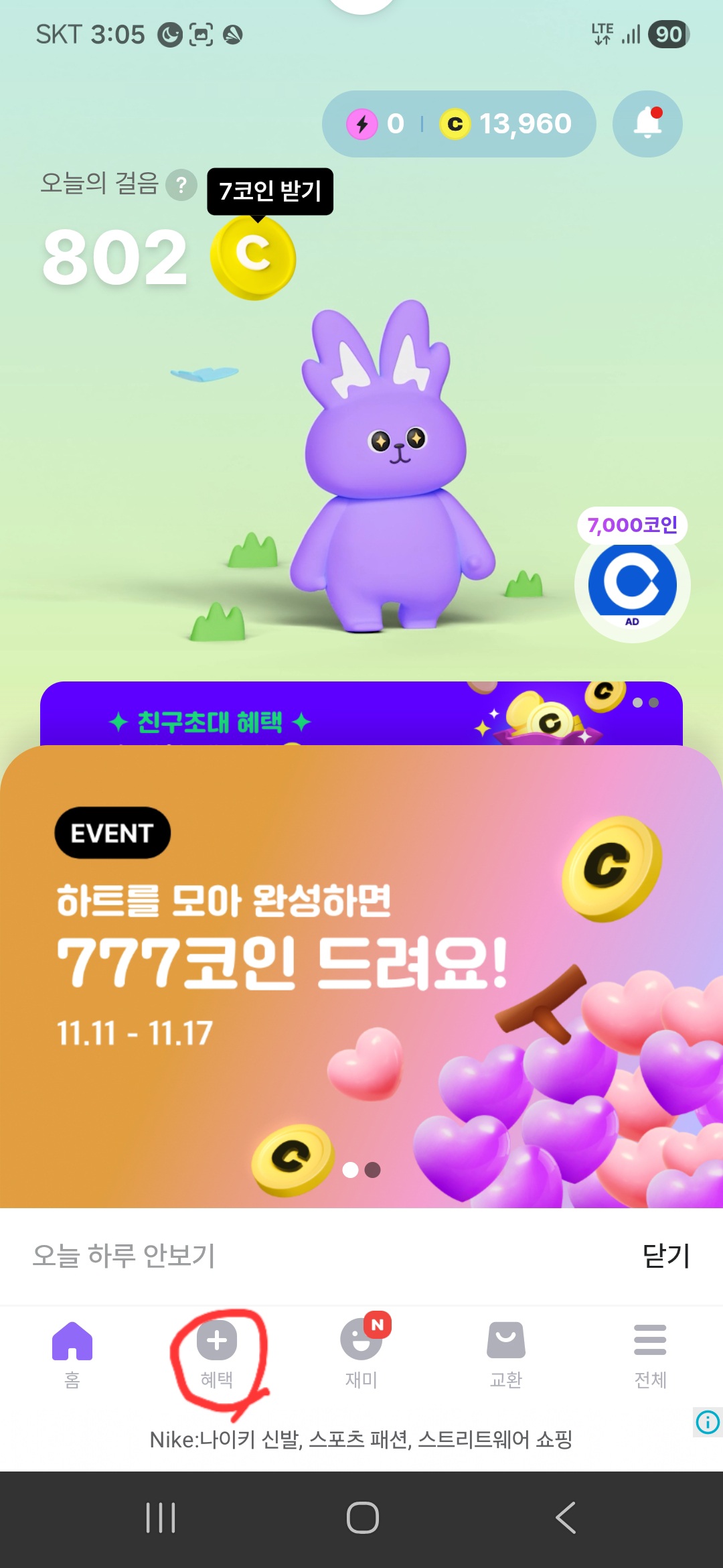 위에 7 코인 받기라고 쓰여있는데 만보기랑 연계되어서 코인을 벌 수 있습니다. 나머지는 모두 혜택에 모여 있습니다.